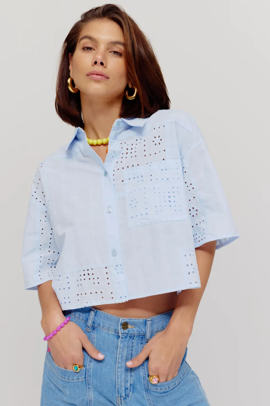 馃┓ Deze lichtblauwe blouse heeft een kort model en een kraagje