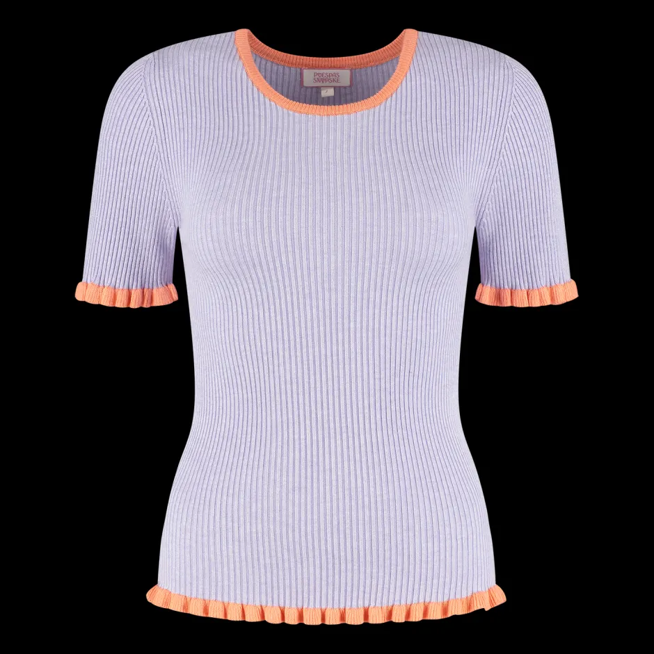 Deze top heeft een ronde hals, ruffles aan de mouwen en aan de onderkant van de top