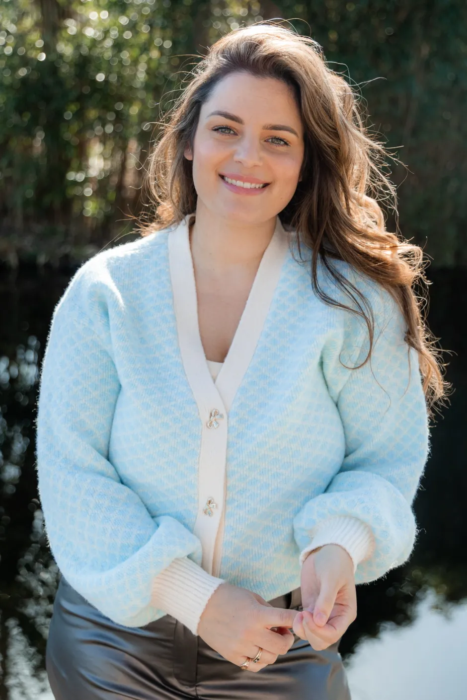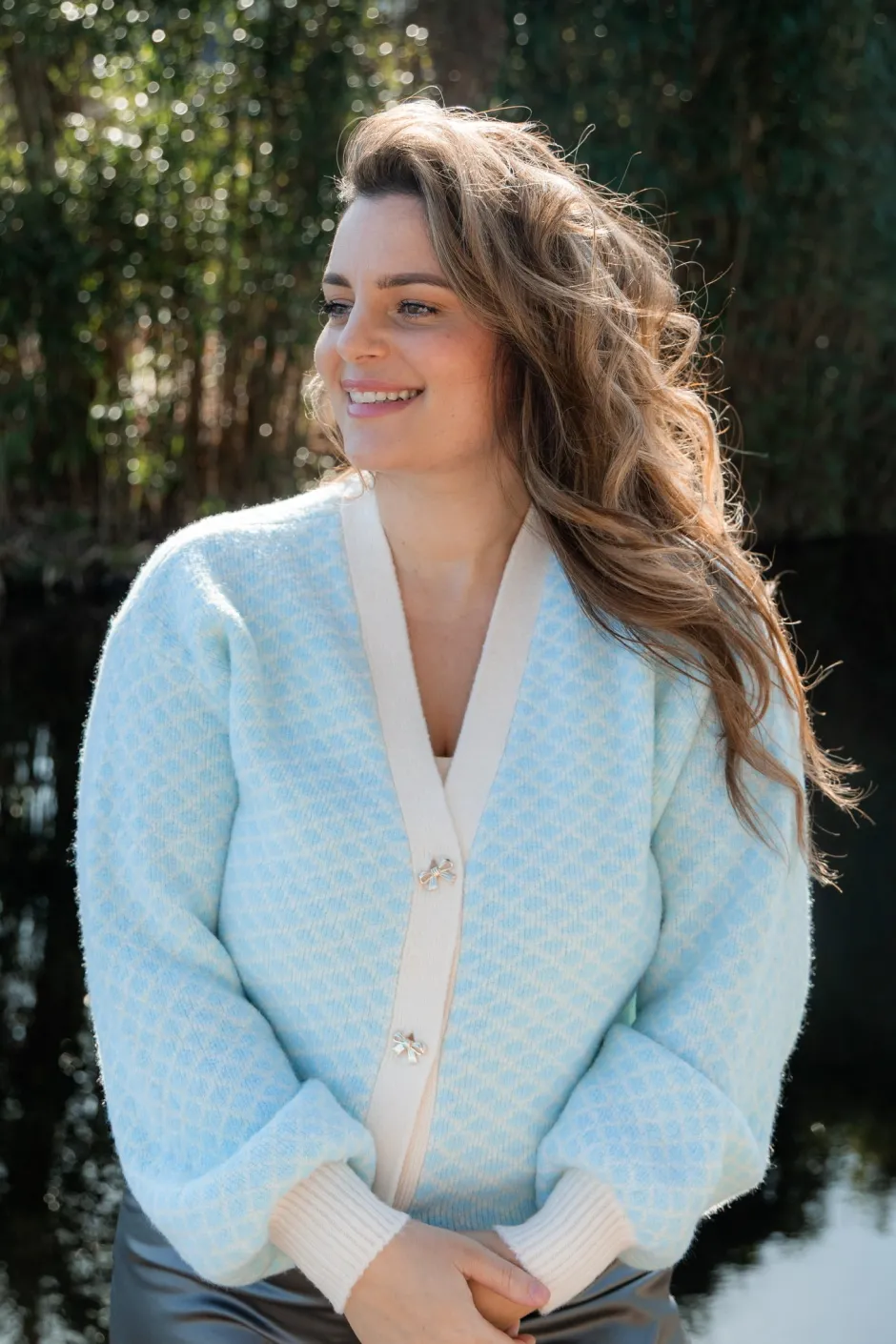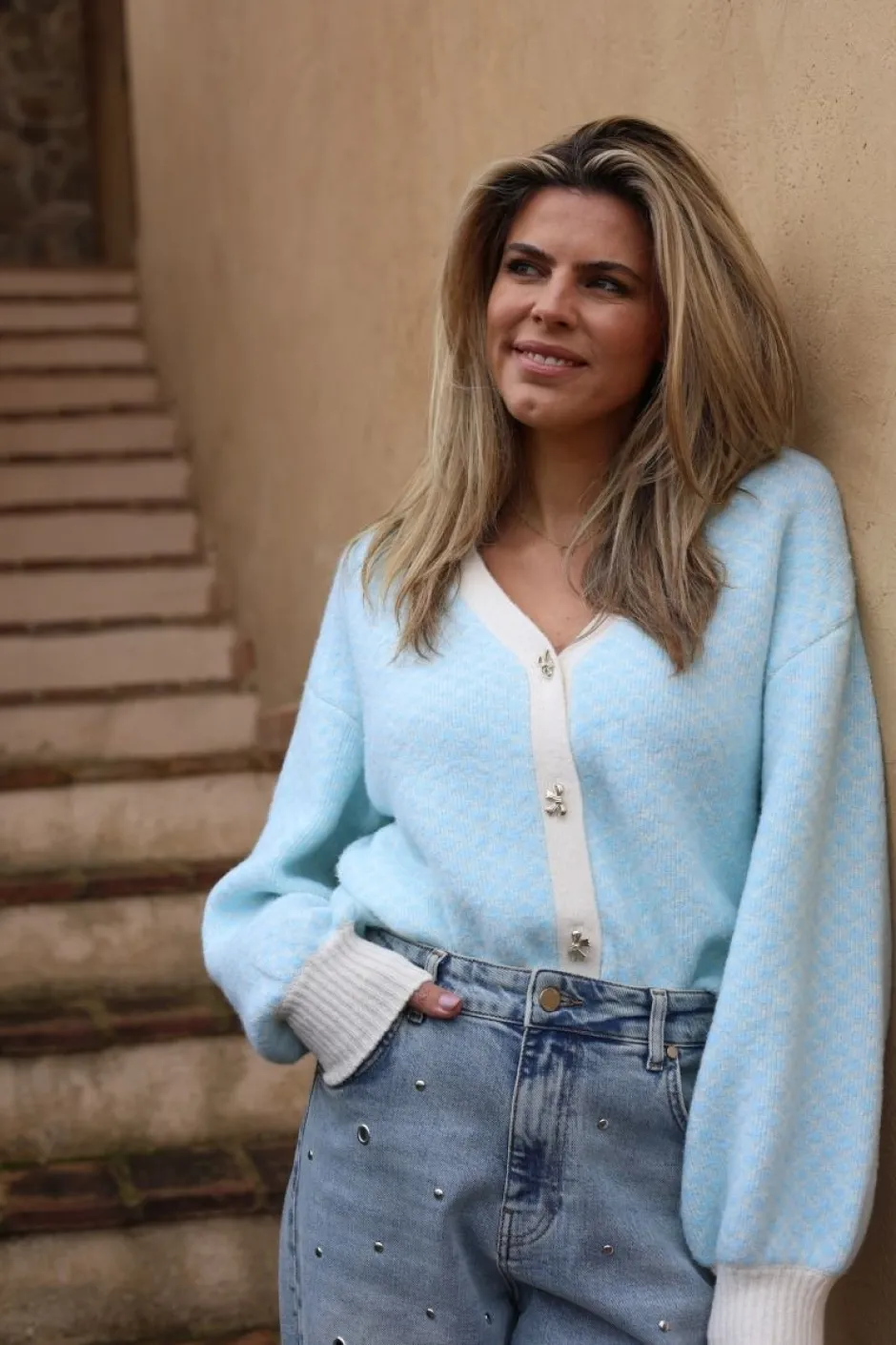 Dit schattige vestje heeft een mooie lichtblauwe kleur en strikjesknopen