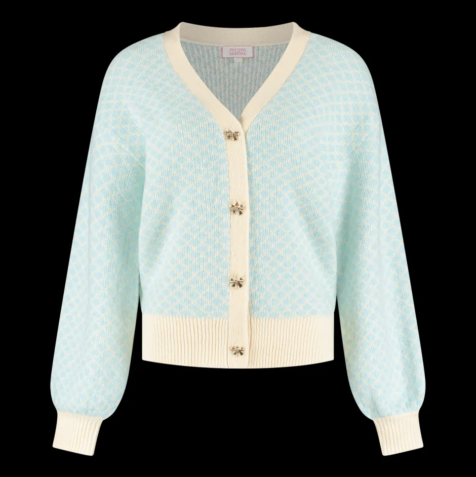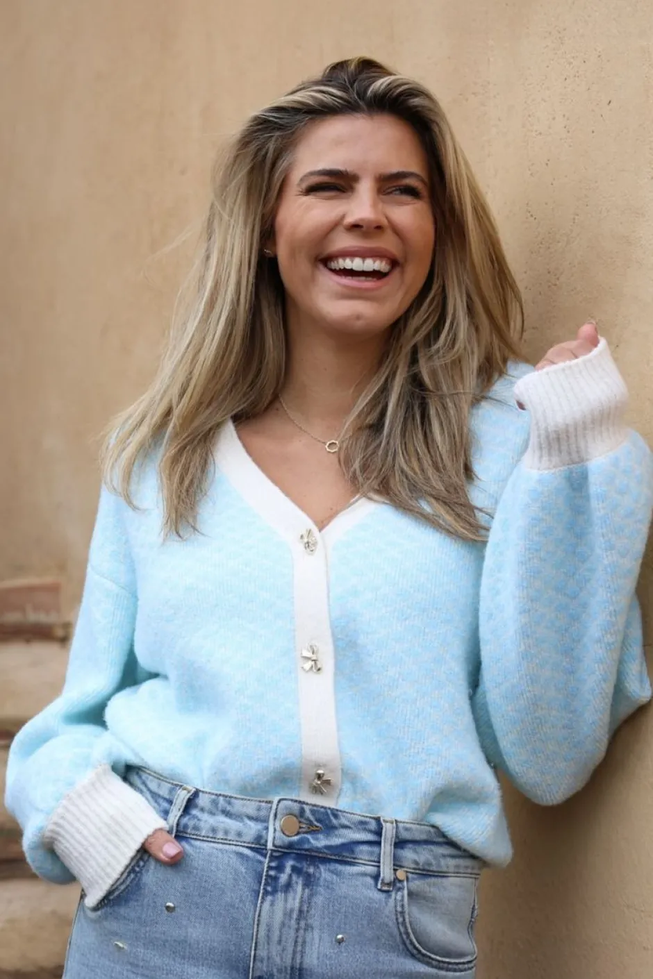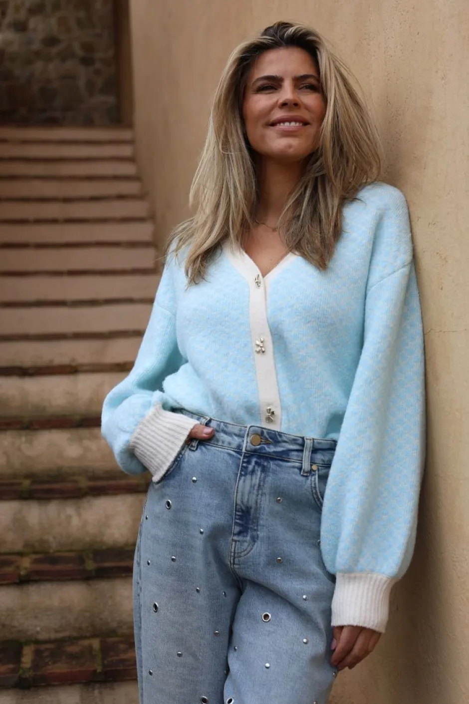 Dit schattige vestje heeft een mooie lichtblauwe kleur en strikjesknopen