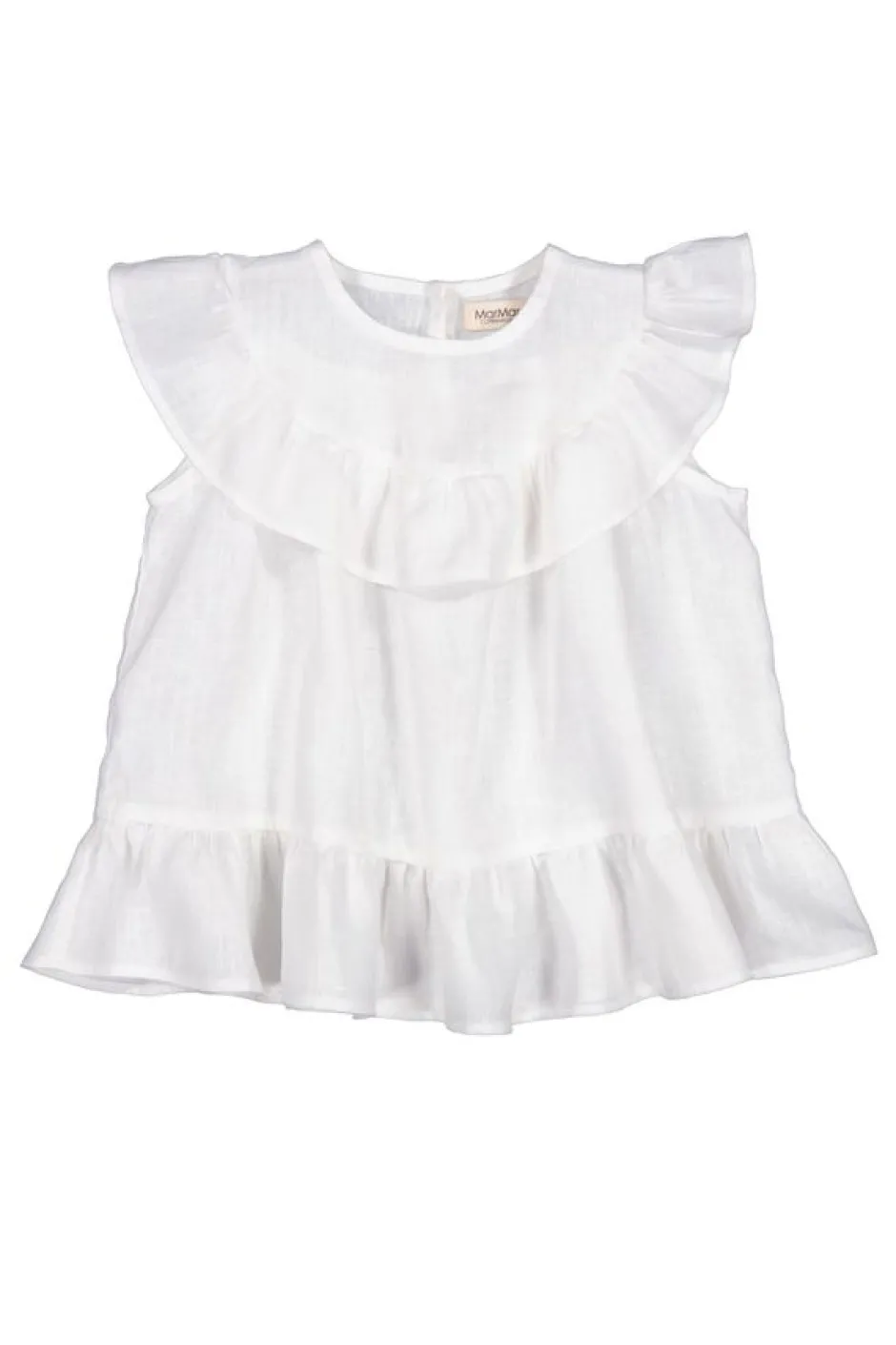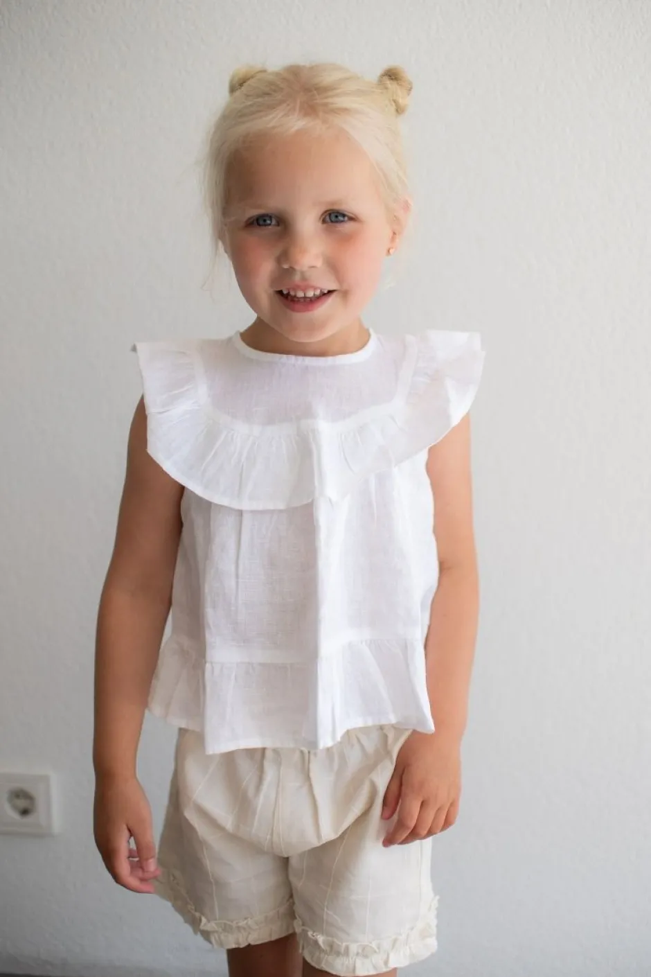 Hoe lief is deze top Tipa van MarMar Copenhagen? Het linnen topje heeft lieve ruffles aan de mouwen en oogt heerlijk zomers. Aan de achterzijde zitten knoopjes ter sluiting.