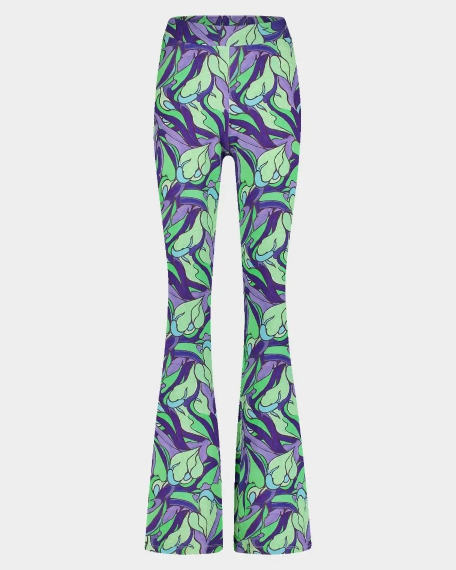 Deze flared broek heeft een all-over, kleurrijke organische print Gemaakt van viscose dus heerlijk zacht en comfortabel! Combineer de broek met de bijpassende trui of een T-shirt
