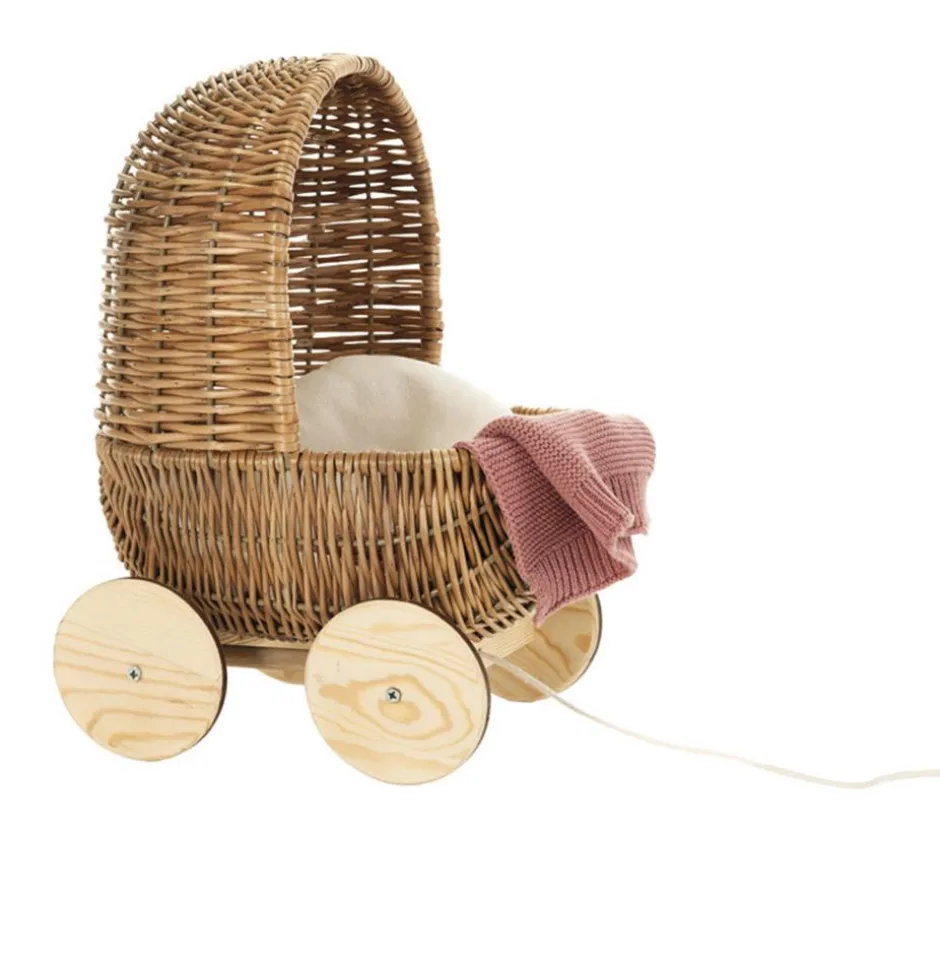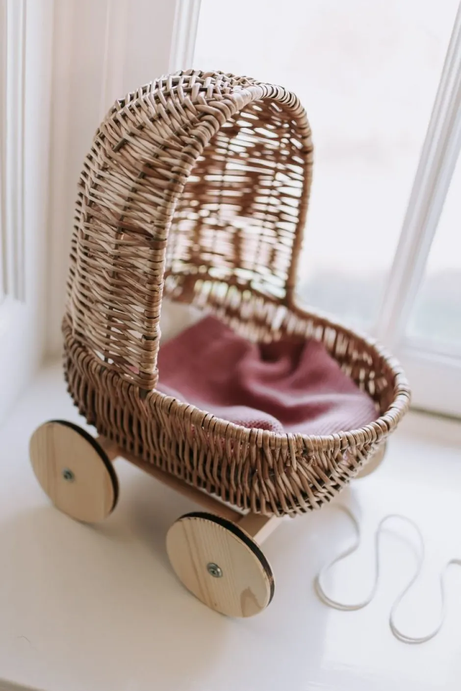 Erop uit samen met je lievelingspoppen! Verplaats jouw favoriete poppen in deze super schattige rieten poppenwagen. De wieltjes zijn van hout en de wagen zelf is van natuurlijk ecologisch riet.