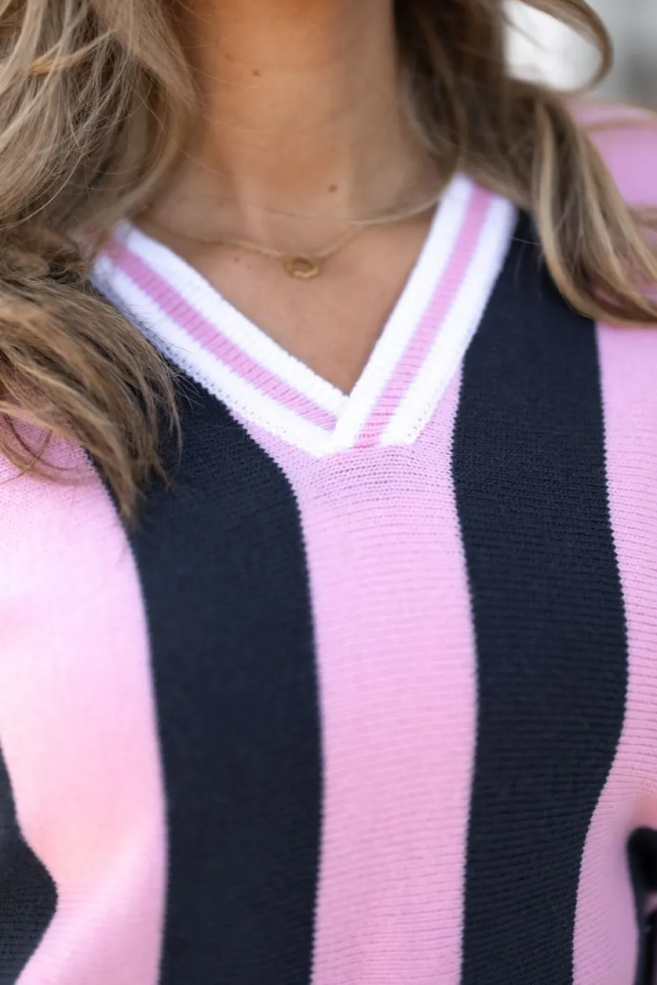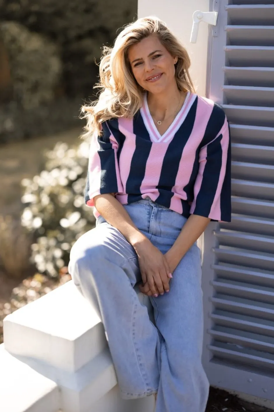 Dit kleurrijke gestreepte shirt heeft een V-hals en een sportieve look!