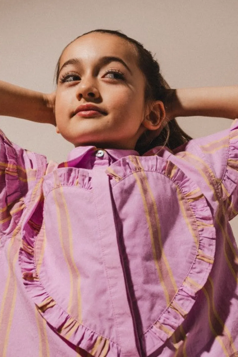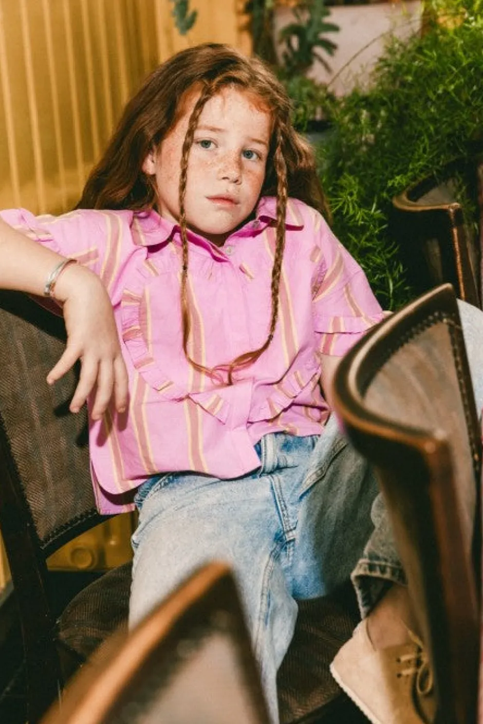 - Deze roze blouse heeft chique ruffles en een mooi kraagje